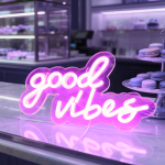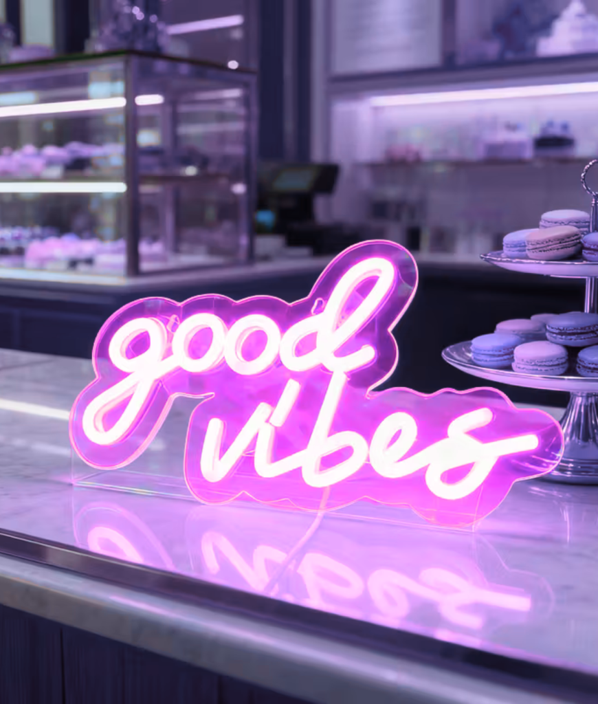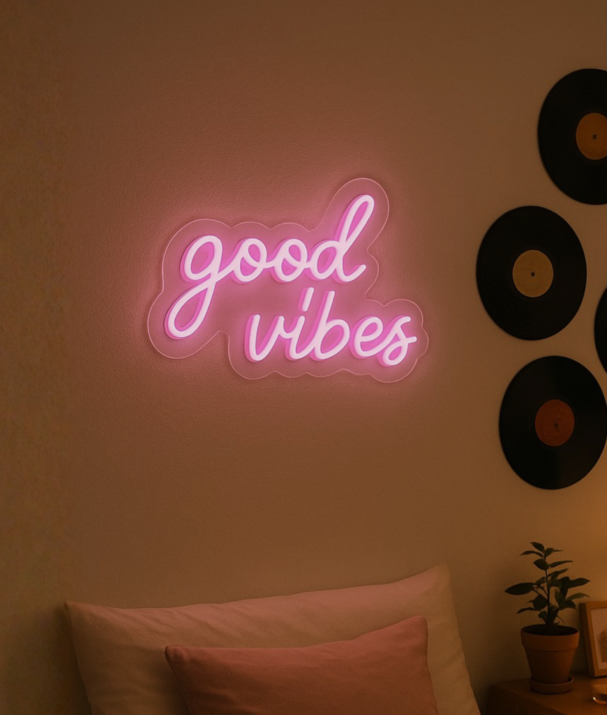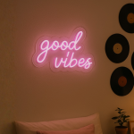 De woorden ‘good vibes’ zeggen het al. Simpel, maar precies raak. Het design is strak en speels tegelijk – die vloeiende letters gloeien in een zachte roze tint die je kamer laat stralen zonder te overdrijven. Het is dat perfecte neonaccent dat sfeer brengt zonder dat het schreeuwerig wordt. Zet ‘m op een plank, hang ‘m aan de muur of laat ‘m pronken boven je bar – het werkt altijd.