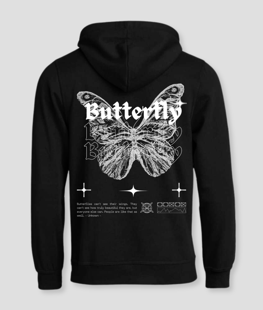Lekker fladderen tijdens een festival of rave met deze butterfly hoodie, we zien je wel linksvoor ergens.