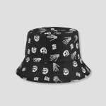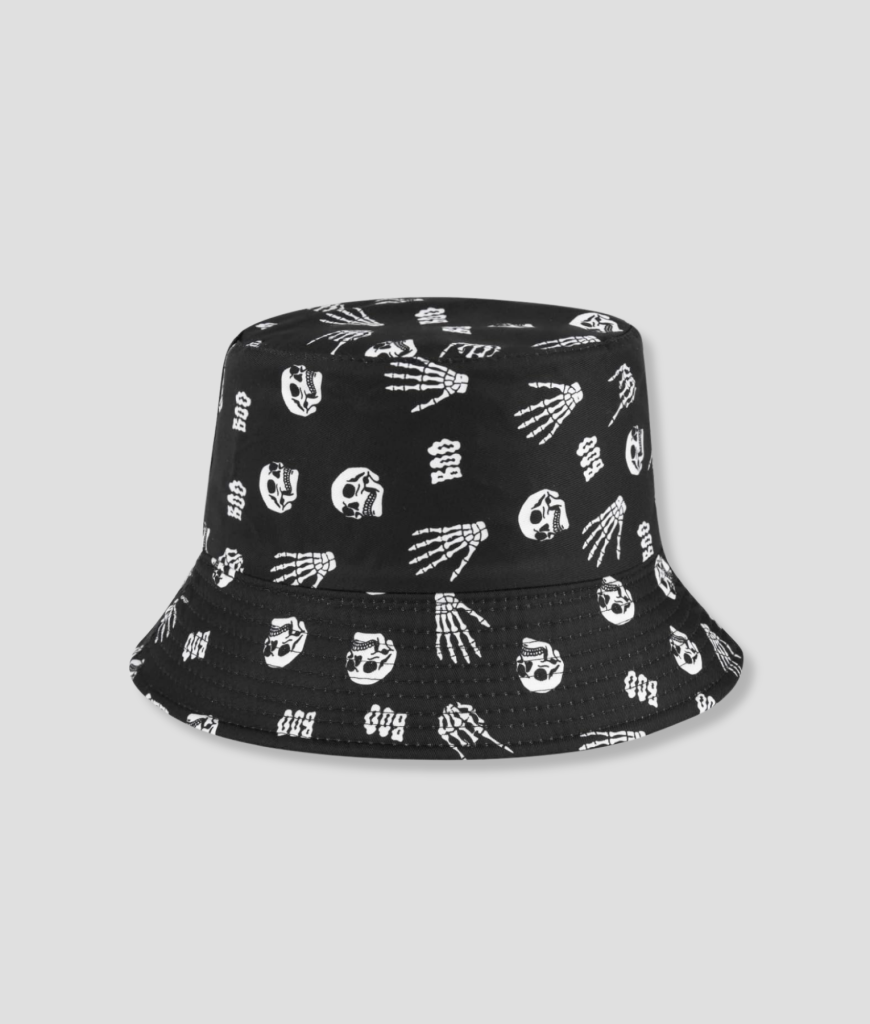 Een strakke, diepzwarte bucket hat als basis. De punchline wordt geleverd door de krachtige, witte all-over print van grimassende schedels, skelethanden en de onheilspellende kreet “BOO!”. De boodschap is brutaal en trekt direct de blikken van zowel medestanders als degenen die bang zijn in het donker. Het is een gewaagde, humoristische statement piece die de discussie op de dansvloer start: “Is het Halloween of is dit mijn everyday vibe?”