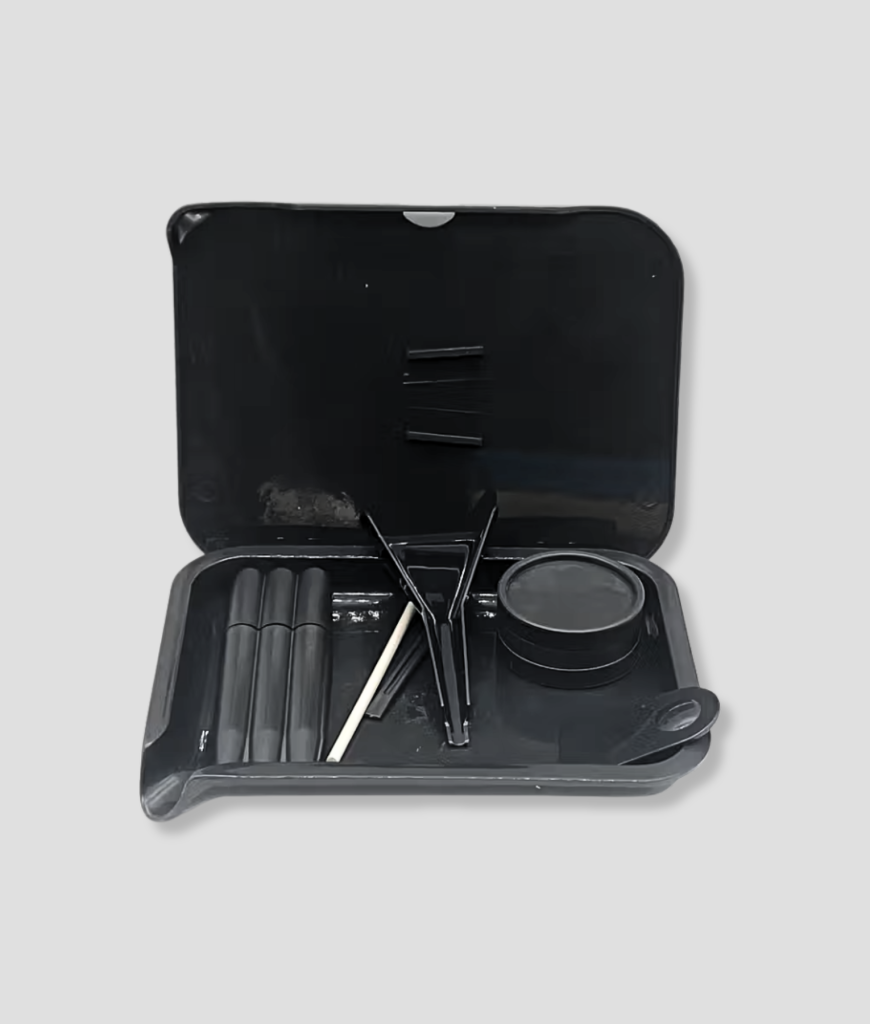 Geen geklooi meer met losse spullen in je broekzak of tasje. Met deze complete, strakke zwarte kit heb je direct alles bij de hand voor een nacht keihard doorhalen op je favoriete rave. Het doosje is stevig, onopvallend en houdt al je essentials veilig en overzichtelijk bij elkaar. Ideaal voor onderweg of in je tentje!