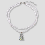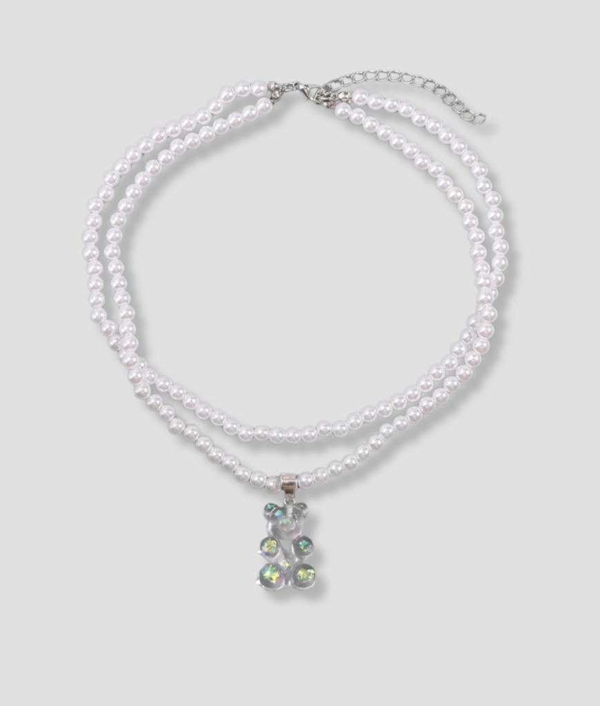 Deze transparente gummy bear lijkt op het eerste gezicht braver dan hij is. Zodra hij licht vangt, knalt hij in alle kleuren terug alsof hij stiekem liever op een rave staat dan in een snoepzakje. De dubbele parelketting geeft dat contrast dat precies past bij iemand die netjes lijkt, maar in het weekend transformeert in een wandelend verhaal. Je draagt hem en mensen denken meteen maat, jij hebt iets te vertellen.