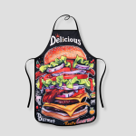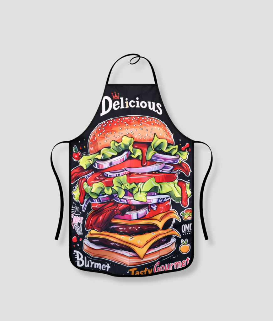 Schort met grote burger print en “Delicious” tekst. Opvallend en ideaal voor koken of BBQ.