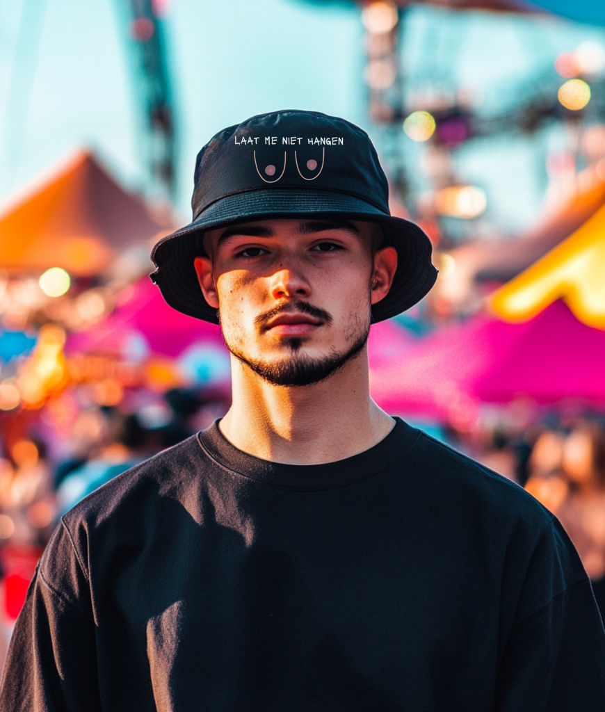 Je kent het, maat. Afspreken met de crew, kaartje scannen, zon op je gezicht en nul plannen behalve “niet laten hangen.” Deze zwarte bucket hat zegt precies dat. Brutaal met een knipoog, studentikoos zonder poeha en klaar om mee te rollen van rooftop borrel naar techno-kelder, van hardstyle stage naar een after die niemand gepland had. Je zet ’m op en je look fluistert: ik ben er, en ik blijf.