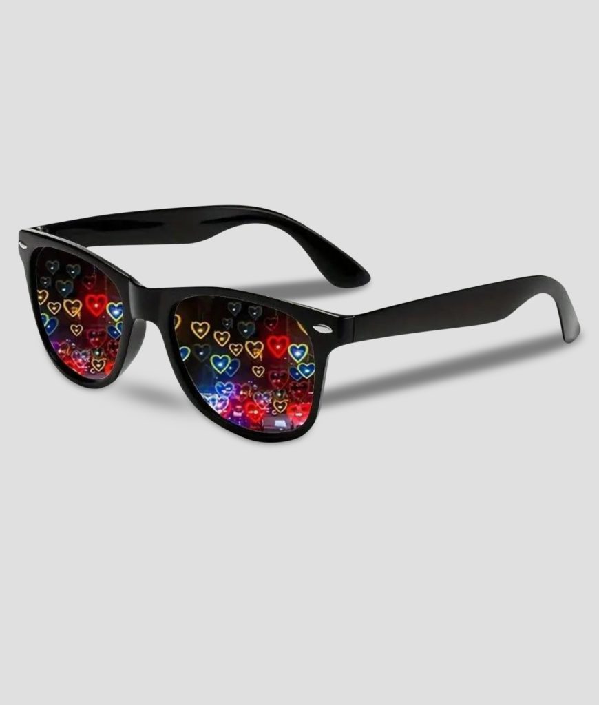 Kijk naar dit montuur, maatje. De basis is een klassieke, zwarte bril, maar de glazen zijn het geheim. Zodra de lichten in de club uitgaan of de stage aangaat, begint de magie. Het is een visueel feest dat perfect past bij de uitbundige vibe van een festival. Het ontwerp is speels, brutaal en herkenbaar. Mensen die de cultuur snappen, zien meteen: dit is iemand die hier is voor de onvergetelijke, chaotische, en liefdevolle momenten. Dit is de ultieme prop voor de feestganger die van elke avond een verhaal wil maken.