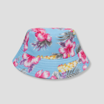 Deze hoed heeft een tropisch design met roze en gele hibiscusbloemen en groene bladeren op een blauwe achtergrond. Het vrolijke patroon zorgt voor een energieke uitstraling en brengt de zomer direct naar je toe.