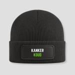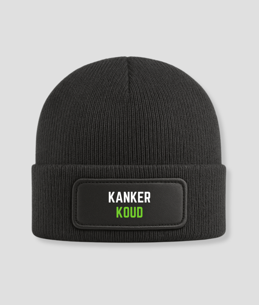 Zwarte beanie met de tekst “kanker koud” op een patch aan de voorkant. Dikke ribstof, strak model. Gemaakt voor echt koude dagen.