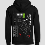 De Hypnotic hoodie speelt met lijnen, symbolen en abstracte vormen waardoor het ontwerp een bijna tech-achtige vibe krijgt. De combinatie van witte outlines, rode hartslaglijn en subtiele groene details maakt het geheel speels en toch strak. De gezichten die in elkaar overlopen geven het idee van beweging en gedachten die door elkaar lopen. Het voelt alsof je naar een visuele mindtrip kijkt die blijft boeien hoe langer je ernaar kijkt.