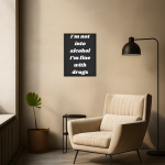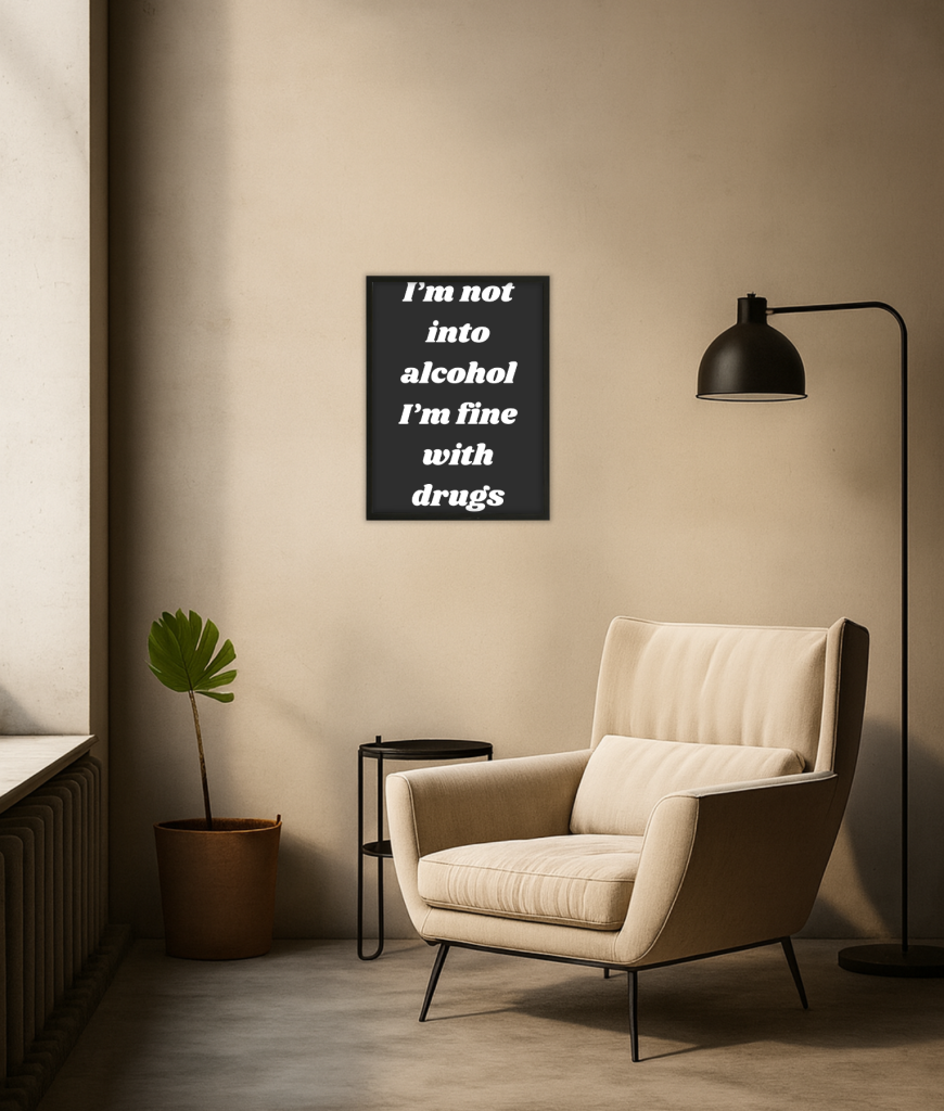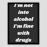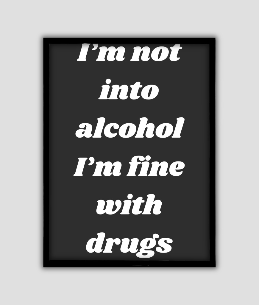 Functionaliteit is noodzaak. Dit is de poster die je eist om je feest-territorium mee te markeren. De korte beschrijving verzekert je dat het direct zegt waar het op staat. Het doel is helder: elke gast moet bij binnenkomst direct weten wat de voorkeur van het huis is en dat er geen discussie over is. Met de poster schreeuw je de boodschap “I’M NOT INTO ALCOHOL I’M FINE WITH DRUGS” en neem je de leiding over de nacht.