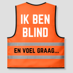 Met dit oranje hesje met de tekst “Ik ben blind en voel graag…” trek je meteen aandacht op een festival of feestje. Het lijkt op een standaard veiligheidshesje, maar de tekst zorgt voor een grappige en opvallende twist.