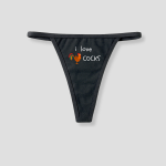 Deze zwarte string laat weinig aan de fantasie over. Ik hou van, met een vrolijke kip erop, zegt precies genoeg zonder dat je er een woord extra aan hoeft toe te voegen. Een perfecte mix van humor en schaamteloze energie. Je trekt hem aan en de vibe staat meteen goed.