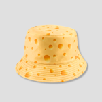Stel je voor: een wiel jonge kaas dat uit de vitrinekast is gejat en in hoedvorm is gegoten. Zachte gele basis met die iconische gaten, alsof je hoofd zojuist een snack is geworden waar de camera niet vanaf kan blijven. Het is dwaas op papier en geniaal in het wild. In de techno bunker vang je stroboscoopflitsen als een walking meme, bij de hardstyle main ben jij het herkenningspunt van de crew, en bij de bar krijg je sneller een praatje dan je “cheddar” kunt zeggen. Deze print laat zien dat jij het leven niet te serieus neemt, maar je uitstraling wél.