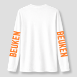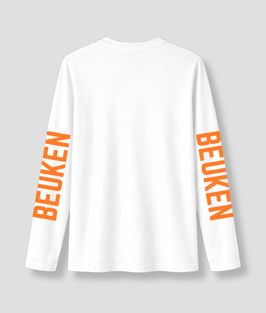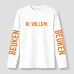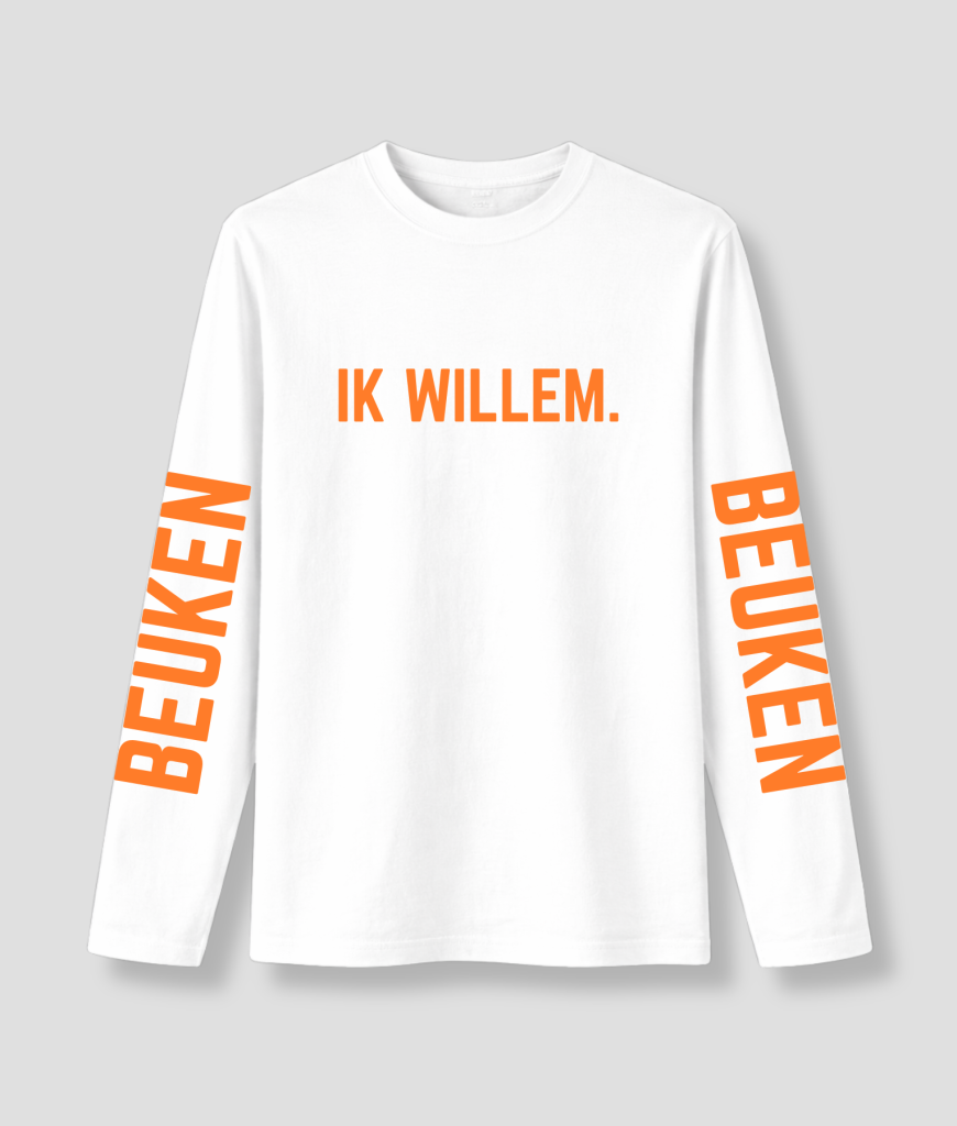 Met zijn stralend witte kleur en de tekst “IK WILLEM” op de voorkant, plus “BEUKEN” op de lange mouwen, heeft dit T-shirt een speelse en gedurfde uitstraling. Het contrast tussen het witte T-shirt en de feloranje tekst maakt het een opvallende keuze voor festivals, feesten en casual outfits. Het is de perfecte manier om je energie en stijl te laten zien, met een beetje humor.