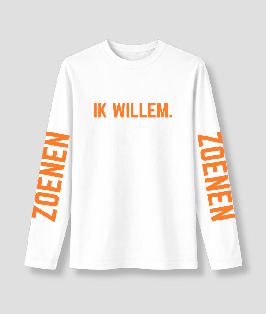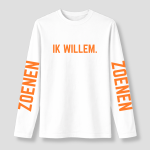 Met zijn stralend witte kleur en oranje tekst “IK WILLEM” op de voorkant, plus “ZOENEN” op de lange mouwen, heeft dit T-shirt een gedurfde en opvallende uitstraling. Het minimalistische ontwerp met de grote tekst maakt het perfect voor festivals, feesten en casual outfits. Het oranje geeft een energieke vibe en zorgt ervoor dat je er altijd fris en stoer uitziet.