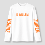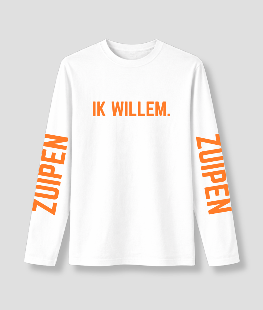 Dit witte T-shirt met oranje tekst “IK WILLEM” op de voorkant en “ZUIPEN” op de mouwen is de perfecte keuze voor een festivaloutfit. Het opvallende ontwerp zorgt ervoor dat je zeker opvalt.