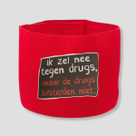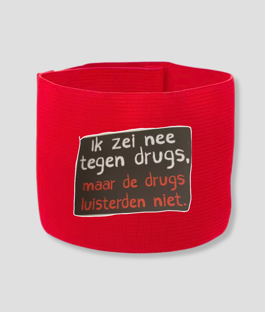 Het rode design knalt hard en de print heeft die handgeschreven chaos die past bij mensen die altijd wel een verhaal hebben. Het ziet eruit alsof iemand het op een servetje krabbelde tijdens een veel te lange nacht. De uitstraling is brutaal, eerlijk en vooral herkenbaar.