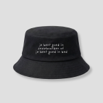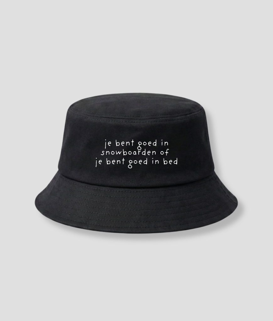 Zwarte bucket hat met “je bent goed in snowboarden of je bent goed in bed” print