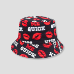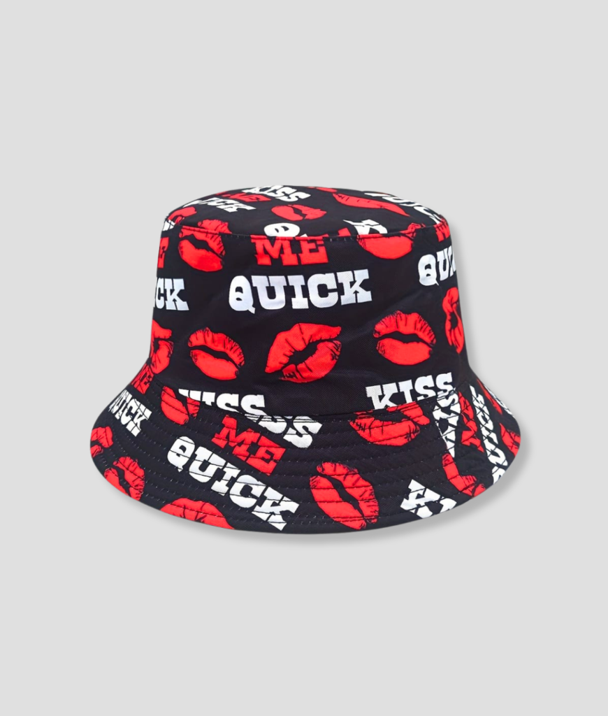 Zwart canvas vol knalrode lipafdrukken en grote letters die precies zeggen wat jij misschien denkt, maar niet altijd uitspreekt. Dit is geen subtiele hoed. Dit is een uitnodiging. Een uitdaging. Een knipoog midden in de nacht. Hij heeft die speelse brutaliteit van iemand die de kamer binnenloopt en meteen weet waar de muziek het lekkerst klinkt.