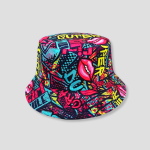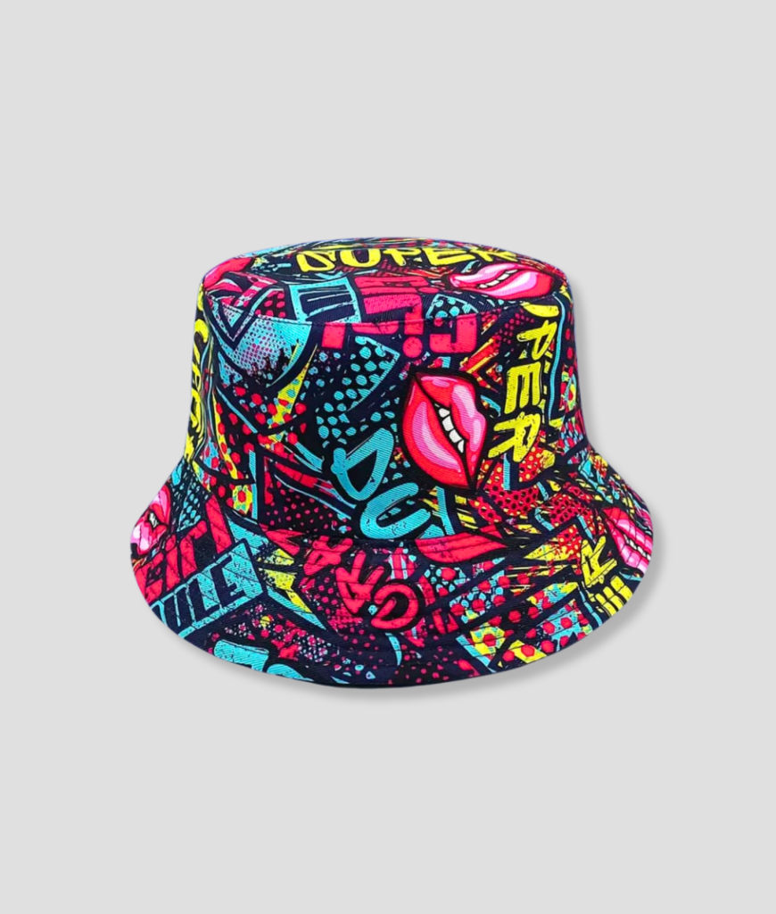 Deze bucket hat is alsof iemand je favoriete metrostation, een nachtelijke clubmuur en een pop-art poster in elkaar heeft gedrukt tot één statement. Fluorprints, chunky letters, cartoon-lippen die knipogen—alles schreeuwt vibe zonder dat jij je stem hoeft te verheffen. Je stapt de club in en de dansvloer leest mee: jij bent hier om de avond aan te zetten.