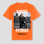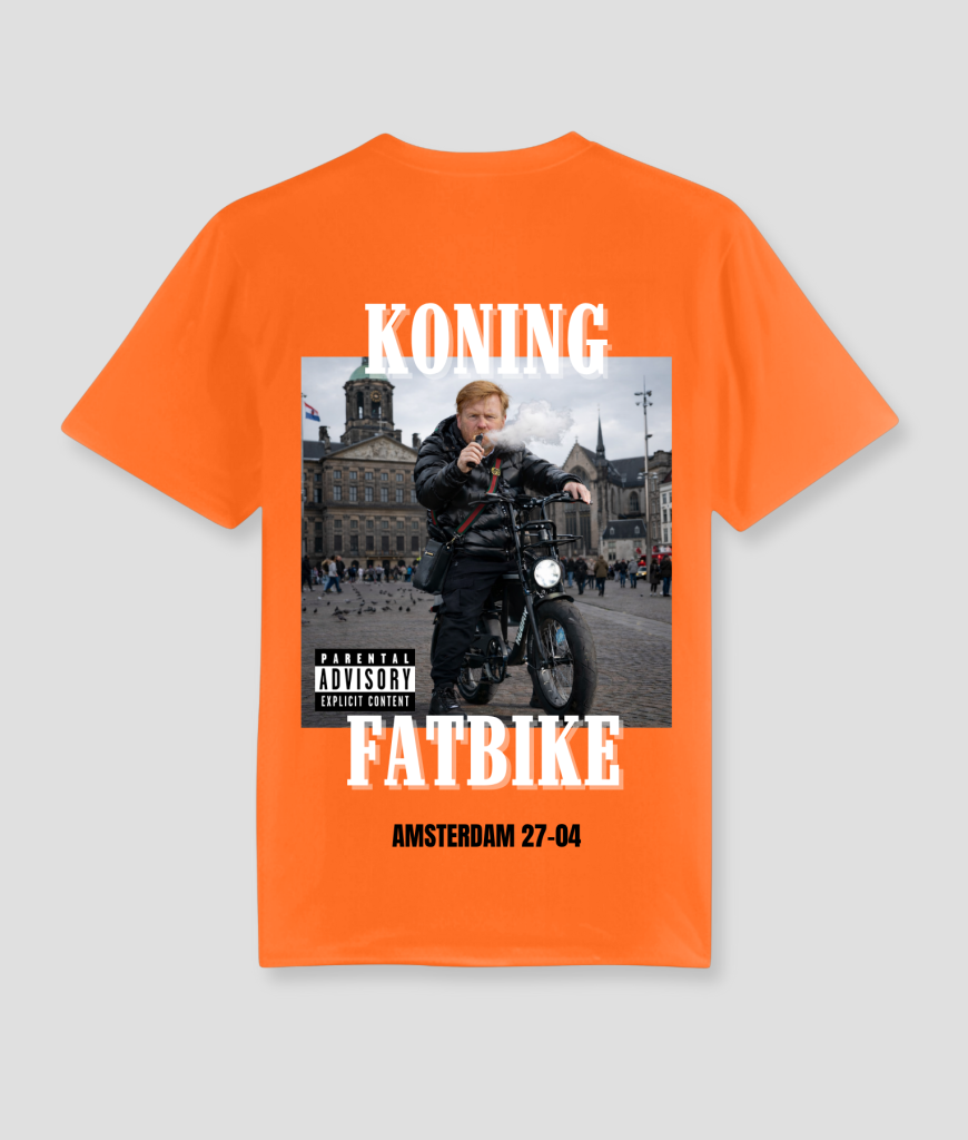Dit shirt draait om één ding: Koningsdag. De print met “KONING FATBIKE” en “AMSTERDAM 27-04” maakt meteen duidelijk waar je staat en wat de vibe is.