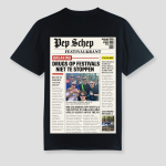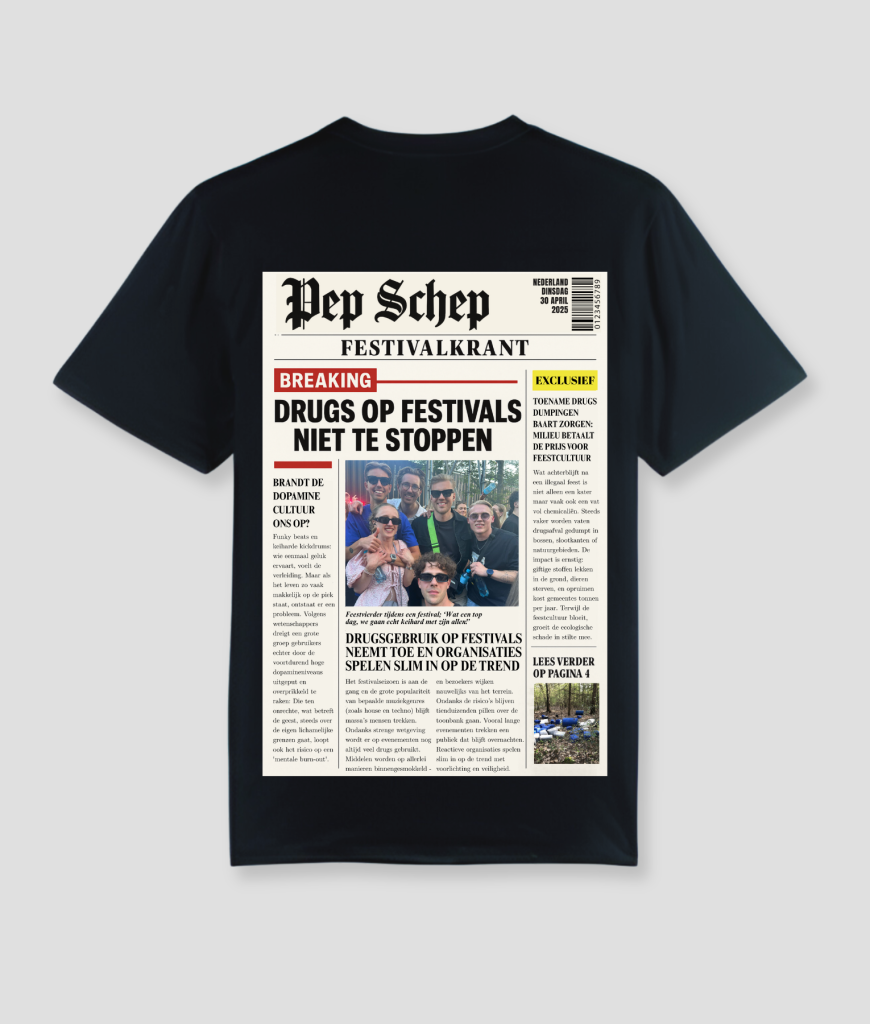 Kies zelf een afbeelding voor op de krant en wij regelen het. Dit shirt is een echte eyecatcher: een festival-krant design vol headlines en foto’s alsof je het voorpagina-nieuws zelf draagt. Het geeft een speelse knipoog naar festivalcultuur en laat zien dat je niet bang bent om op te vallen. Perfect voor feesten, festivals en afters.