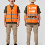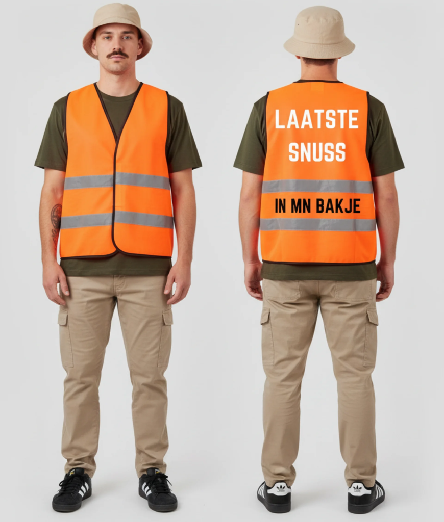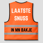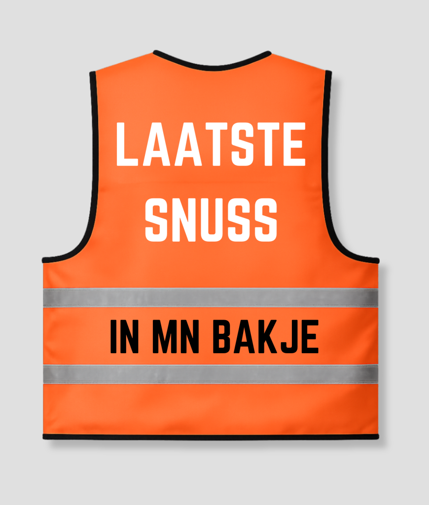 Dit oranje hesje met de tekst “Laatste snuss in mn bakje” is een grappige outfit voor festivals, studentenfeestjes en een avond stappen. Door de felle kleur en duidelijke tekst val je meteen op.