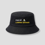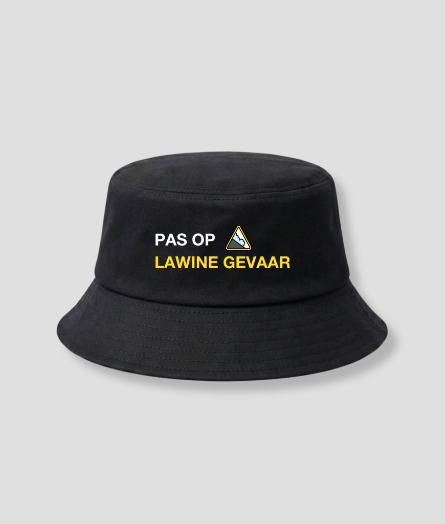 De bucket hat is gemaakt van stevige stof en blijft goed in model. Op de voorkant staat de tekst “Pas op lawine gevaar” met een waarschuwingssymbool. De gele tekst contrasteert sterk met de zwarte achtergrond, waardoor de print goed zichtbaar is.