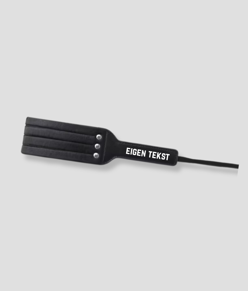 Een leren zweep met meerdere stroken en jouw eigen tekst op het handvat. Geschikt voor gebruik in de slaapkamer, als cadeau of voor een thema-avond. De tekst die je invoert wordt exact zo gedrukt.