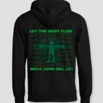 De tekst “Let The Body Flow” herhaalt zich in een energieke stijl, terwijl het figuur in beweging de vrijheid en passie van de ravecultuur symboliseert. Deze hoodie is ideaal voor het loslaten op de dansvloer, met een ontwerp dat de energie en vrijheid van de muziek vastlegt.