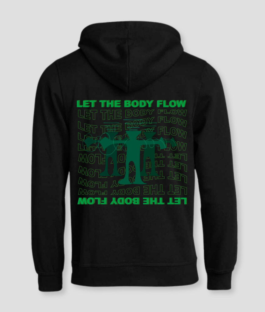 De “Let The Body Flow” hoodie is dé perfecte outfit voor iedereen die zich volledig wil laten meevoeren door de muziek. Met het krachtige “Let The Body Flow” ontwerp en een dynamisch figuur op de achterkant, is deze hoodie een visuele uitnodiging om alles los te laten en de beat te volgen.