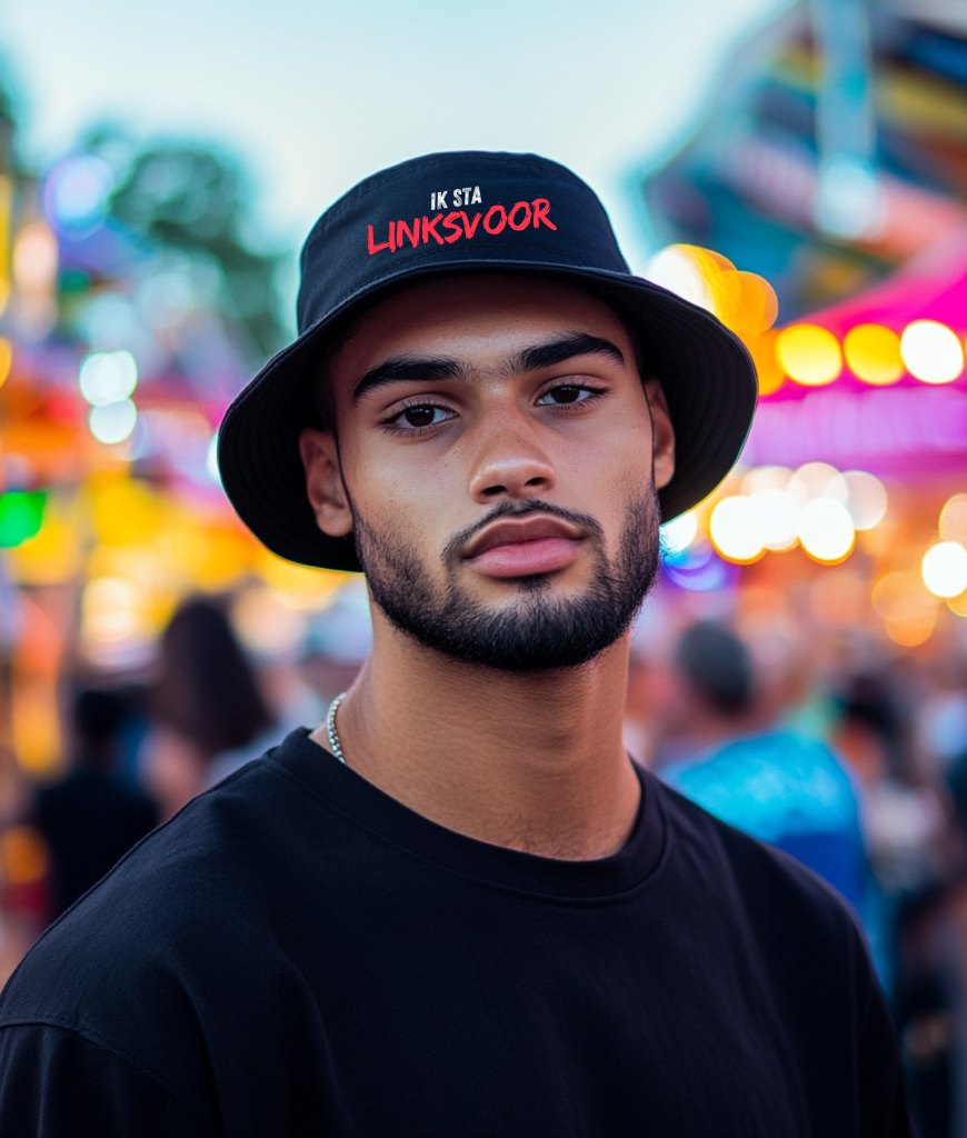 Je kent de code, maat. Spreek je af met de crew, zet een pin op de plattegrond en iedereen weet het: linksvoor. De plek waar je de drop voelt vóór je ‘m hoort, waar je vrienden vindt zonder te appen en waar elke set als eerste binnenkomt. Deze zwarte Linksvoor Bucket Hat is die afspraak in textiel. Brutaal genoeg om te zeggen waar jij thuishoort, relaxed genoeg om het nonchalant te houden. Van techno-kelder tot hardstyle mainstage, van kleine club tot openlucht rave—je zet ‘m op en je staat al half op de dansvloer.