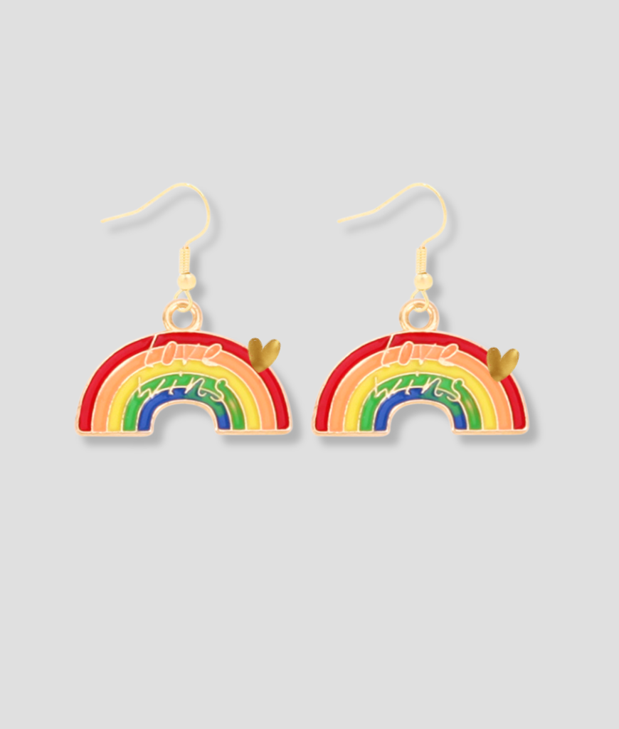 De Love Wins Rainbow Hart oorbellen combineren een kleurrijke regenboog met twee kleine gouden hartjes voor een extra lieve touch. Het geheel heeft een vrolijke en warme uitstraling. Ideaal om elke outfit wat zachter en vrolijker te maken.