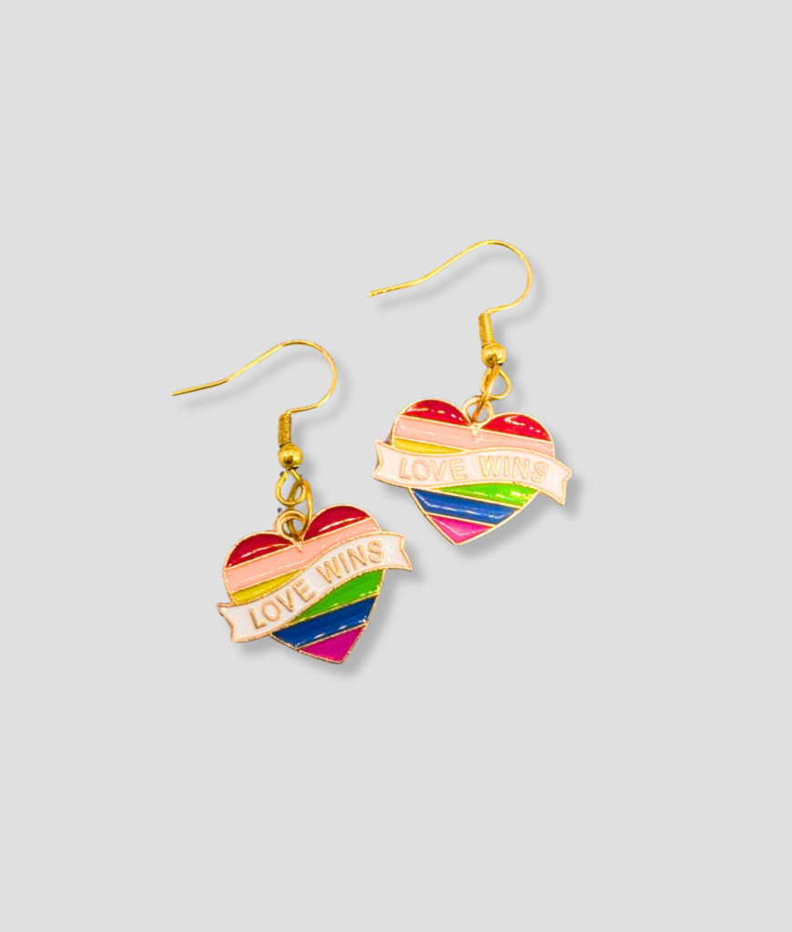 Je hebt hier niet zomaar oorbellen, amigo, dit zijn kleine spandoeken voor je oren. Dat hart knalt qua kleur, met die regenboog die net zo hard shinet als jij na een lange clubnacht. Die banner met Love Wins voelt alsof je een mini-stage aan je outfit hangt. Iedereen die dit leven snapt, ziet meteen dat jij iemand bent die zijn plek inneemt op de dansvloer zonder twijfel.