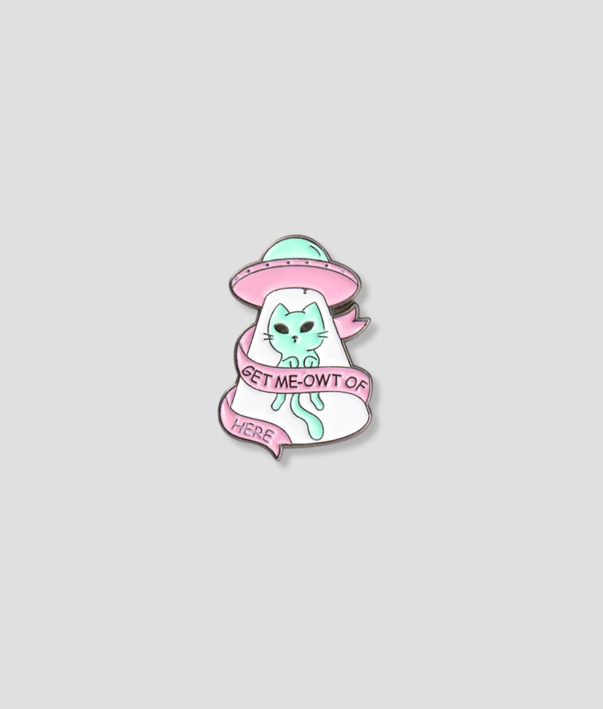 Meow Alien is de pin voor iedereen die het liefst met een UFO vol katten de aarde verlaat. Zachte pastelkleuren, een alien kat met attitude en een lint dat schreeuwt om ontsnapping. Cute, vreemd en precies chaotisch genoeg om elke outfit net iets leuker te maken.
