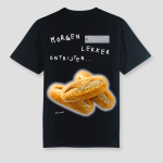 Dit shirt heeft een grappige en luchtige vibe met de tekst “Morgen lekker ontbijten…” bovenop een stapel versgebakken broodjes. Het combineert humor met een alledaags moment dat iedereen herkent. Precies dat soort ironische festivalstijl waar je mee scoort.
