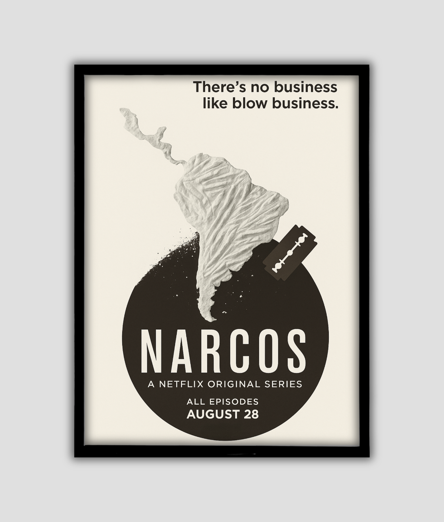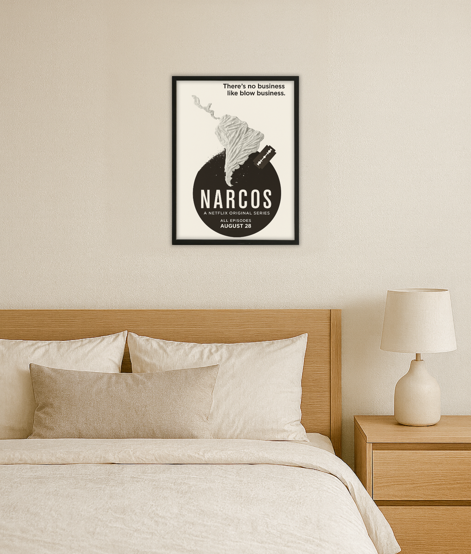 Lijst in strak zwart-wit met “NARCOS”, de release “August 28” en de tagline “There’s no business like blow business.” Minimalistisch en stoer, ideaal voor fans die hun kamer een crime-serie vibe willen geven.