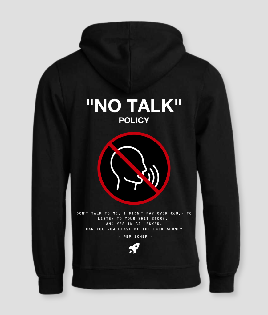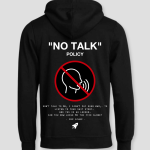 De hoodie heeft een opvallend design met een iconische “no talking” symbool op de achterkant, samen met de tekst “NO TALK POLICY”. De humoristische quote benadrukt je recht om met rust gelaten te worden – dit is de perfecte hoodie voor de niet-prater die zijn tijd liever doorbrengt met het voelen van de beats dan met gesprekken.