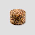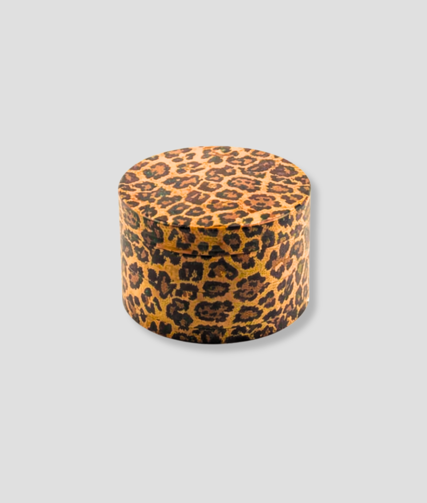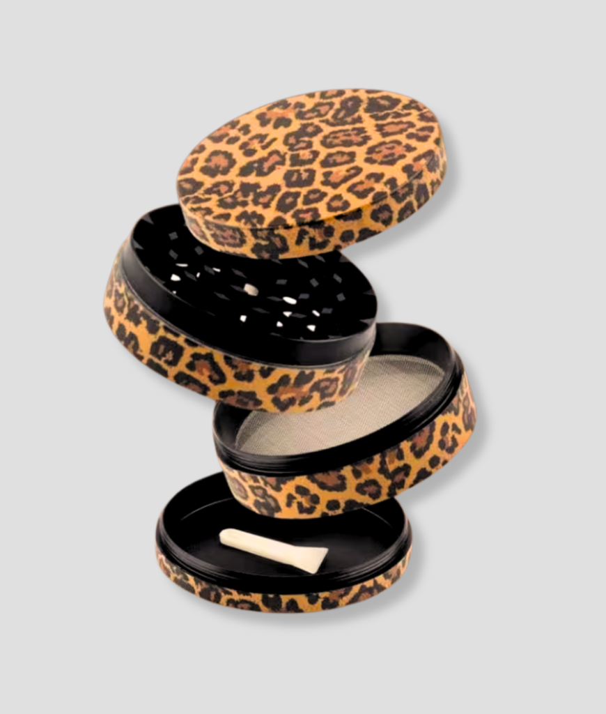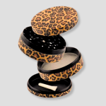 Grinder met luipaard print. Maalt je “kruiden” fijn en vangt kleine deeltjes op in het onderste vak.