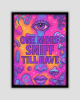 Lijst met psychedelische illustraties, ogen en glitters, plus de grote tekst “ONE MORE SNIFF TILL RAVE.” Over-the-top clubposter vibe, bedoeld als satirische grap.