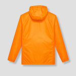 Deze oranje regenjas is gemaakt voor natte dagen waarop je toch naar buiten moet. De jas heeft een ritssluiting aan de voorkant, een capuchon met trekkoord en steekzakken aan beide kanten.
