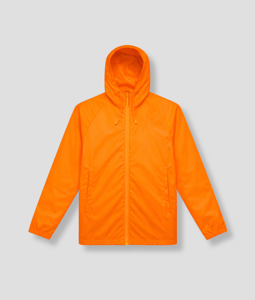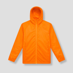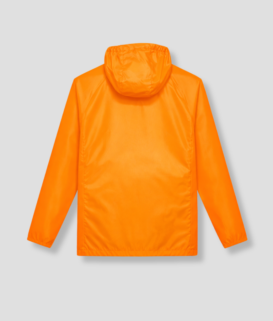 Je krijgt een lichtgewicht regenjas in opvallend oranje. Voorzien van rits, capuchon en elastische manchetten. Makkelijk over een hoodie of trui te dragen.