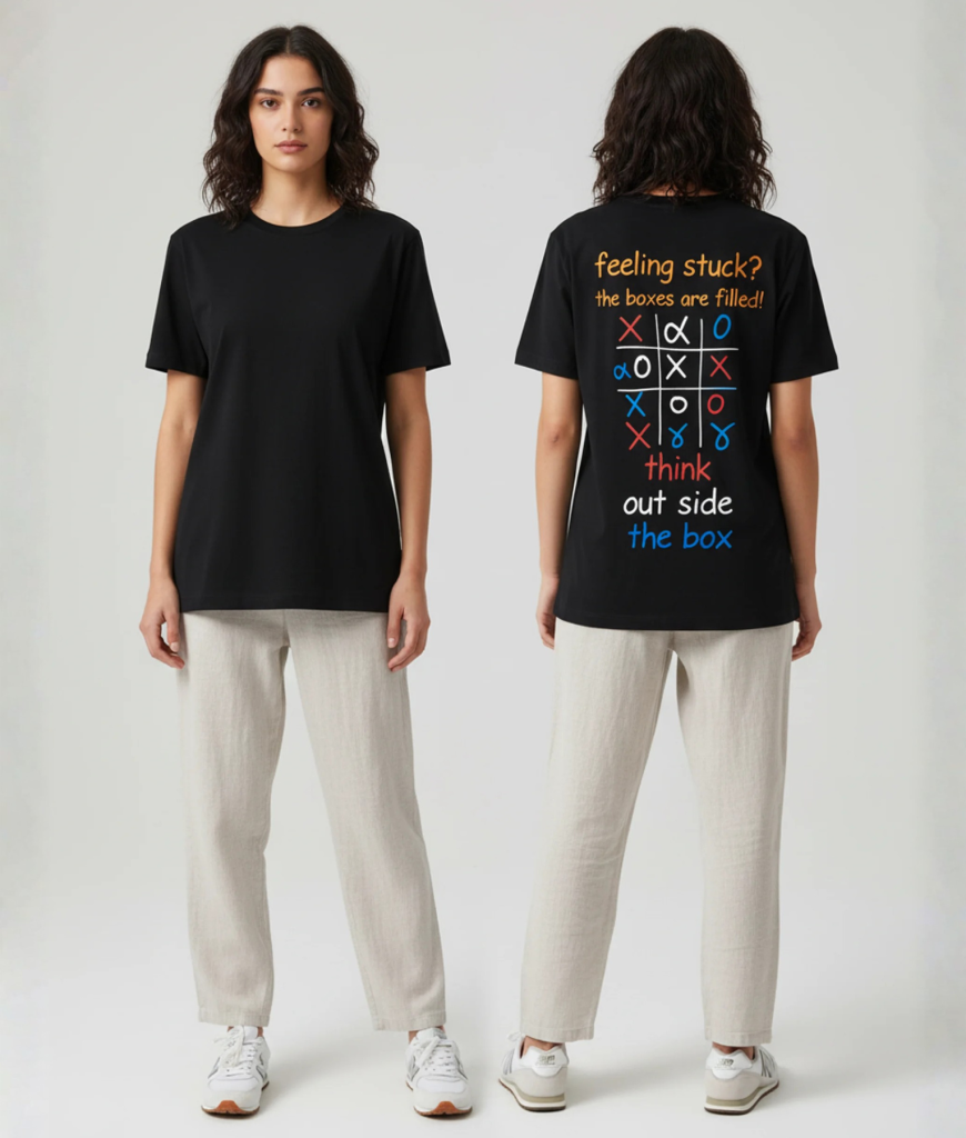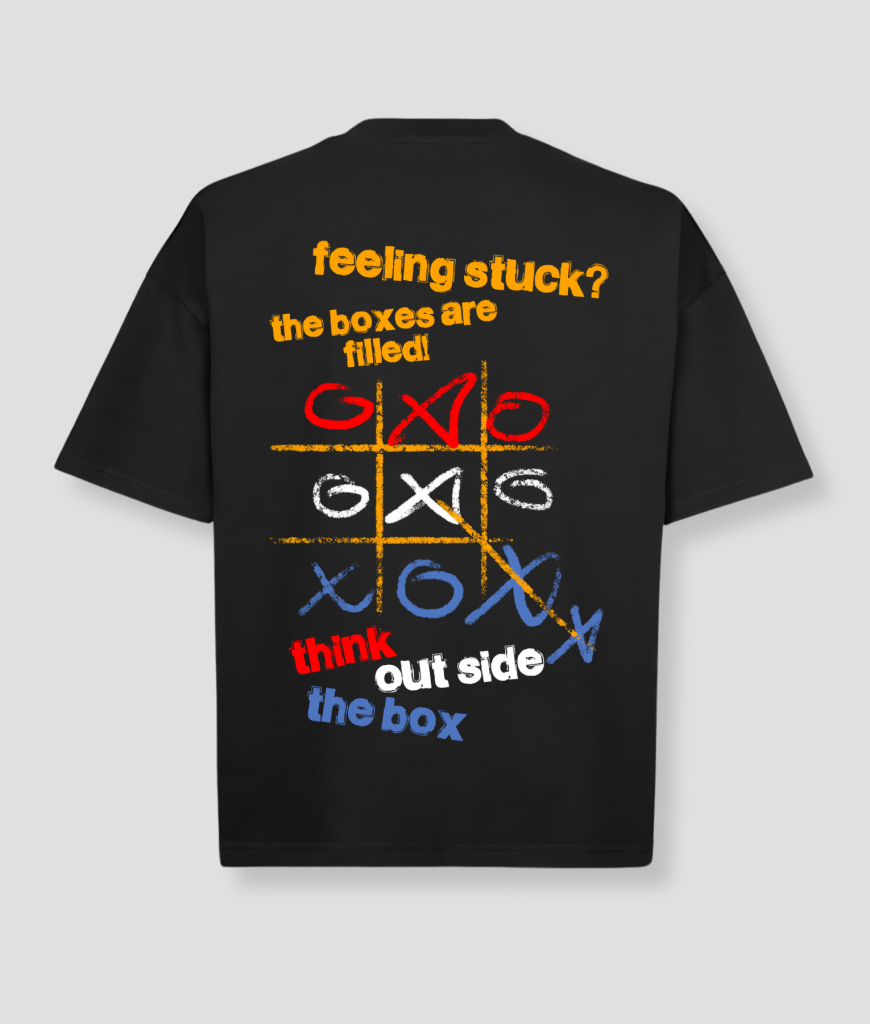 Outside the box – Voor de denkers, dromers en dwarsliggers. Dit shirt laat zien dat jij altijd een creatieve manier vindt om te winnen, zelfs buiten de lijntjes.
