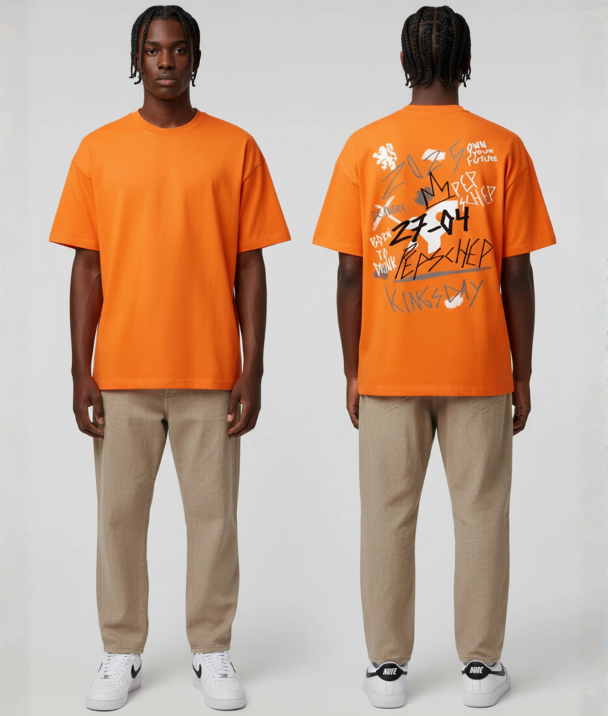 Dit shirt is een chaos aan teksten, een ode aan 27-04 en 100% festivalwaardig. Pep-schep, linksvoor, klaar voor de start – jij bent niet te missen deze Koningsdag.