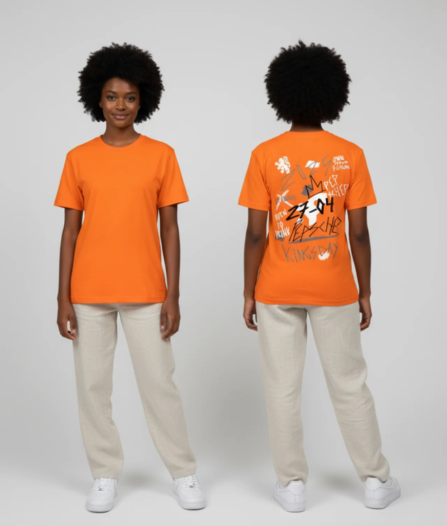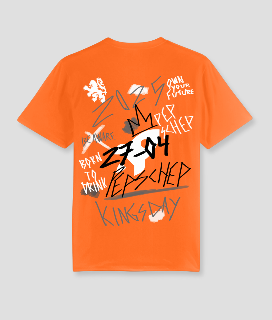 Dit shirt is een chaos aan teksten, een ode aan 27-04 en 100% festivalwaardig. Pep-schep, linksvoor, klaar voor de start – jij bent niet te missen deze Koningsdag.
