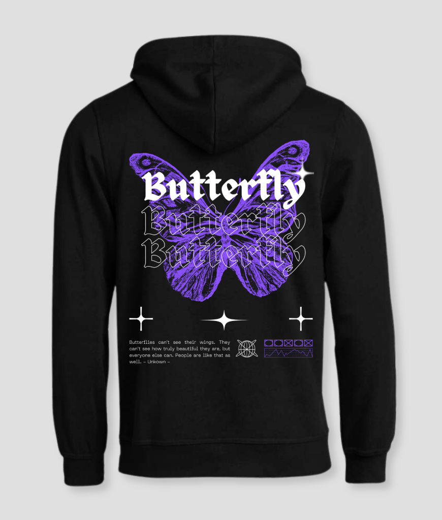 Met de Butterfly Hoodie maak je een mode-statement dat niet alleen visueel opvalt, maar ook een krachtige boodschap uitdrukt over schoonheid en zelfacceptatie. Het is de perfecte hoodie voor iedereen die van betekenisvolle en unieke kleding houdt.