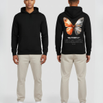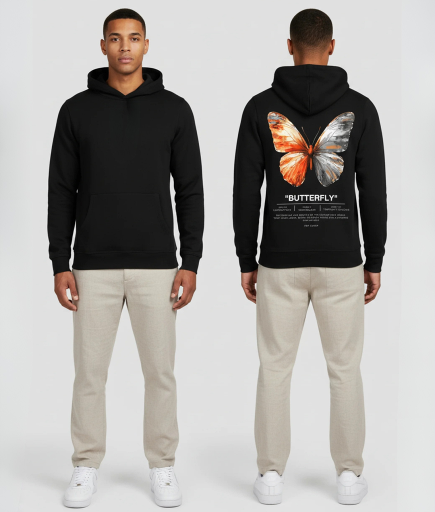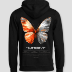 Zwarte hoodie met grote kunstzinnige vlinderprint. Comfortabele stof, sterke kleuren en een design vol symboliek. Perfect voor een stijlvolle en betekenisvolle streetwear look.