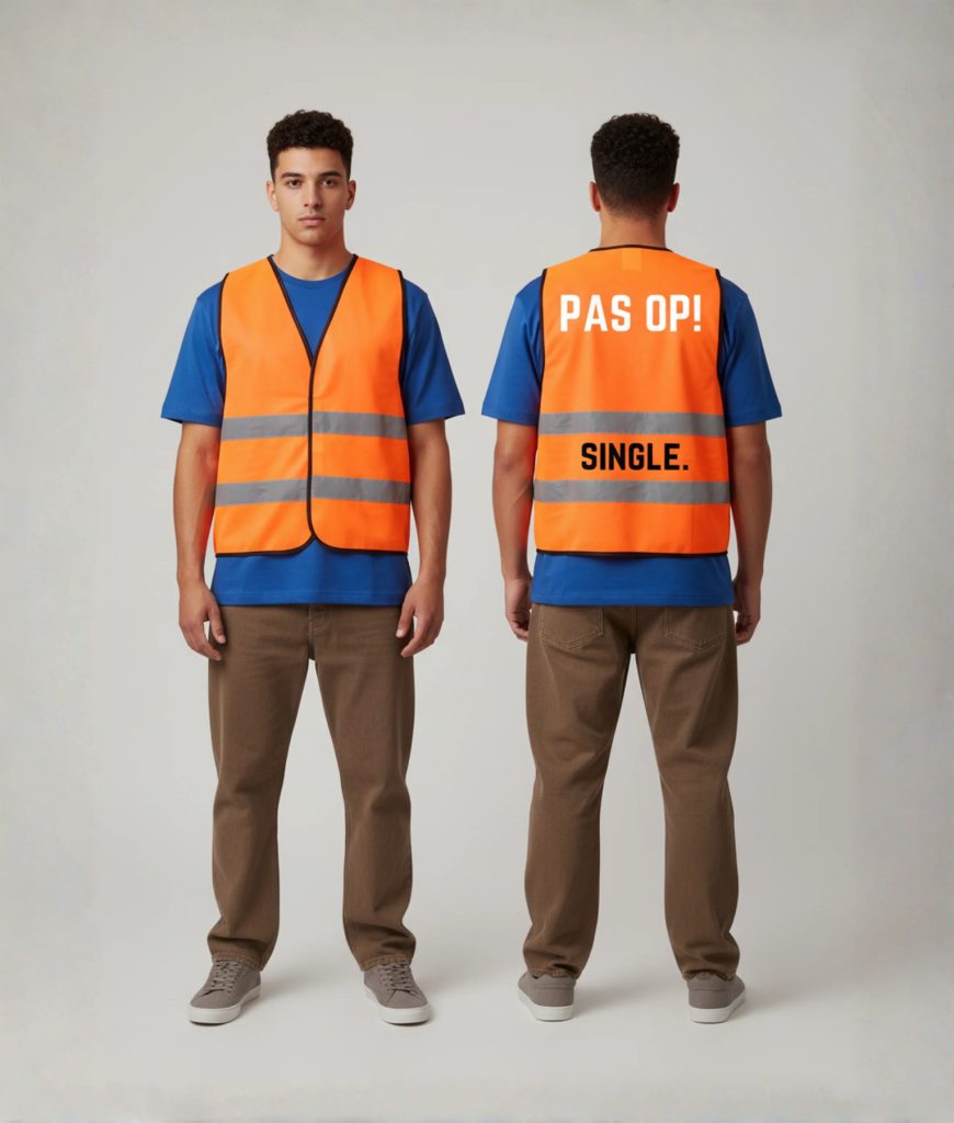 Met dit oranje hesje met de tekst “Pas op! Single.” heb je snel een opvallende outfit voor een festival of feestje. Het lijkt op een standaard veiligheidshesje, maar de tekst zorgt voor een grappige twist.