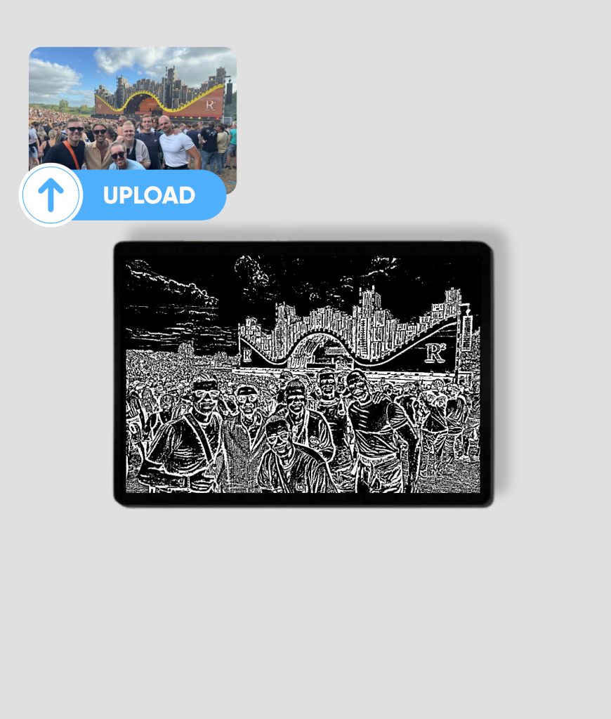 Transformeer je vetste festival- en rave-momenten in een uniek kunstwerk op je eigen custom tray. Upload je favoriete groepsfoto en laat deze permanent vastleggen in een strakke, zwart-witte laser-geëtste stijl. Het perfecte, persoonlijke aandenken voor elke festival-vriend!