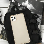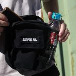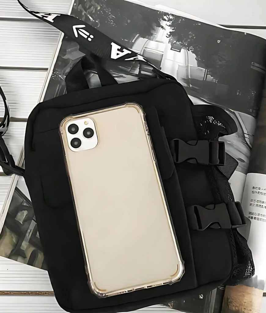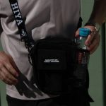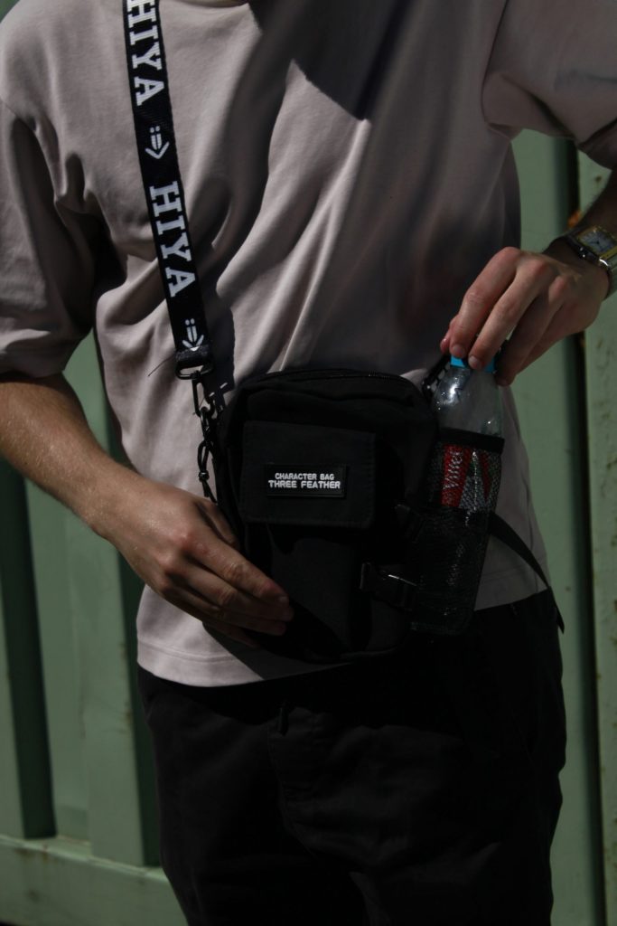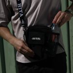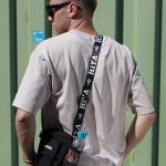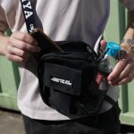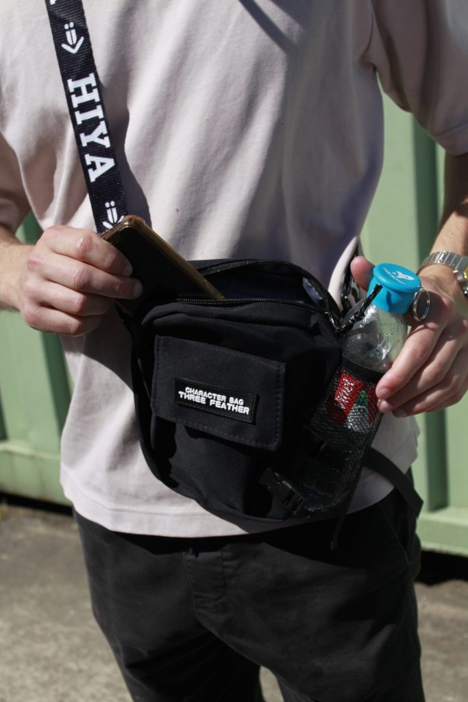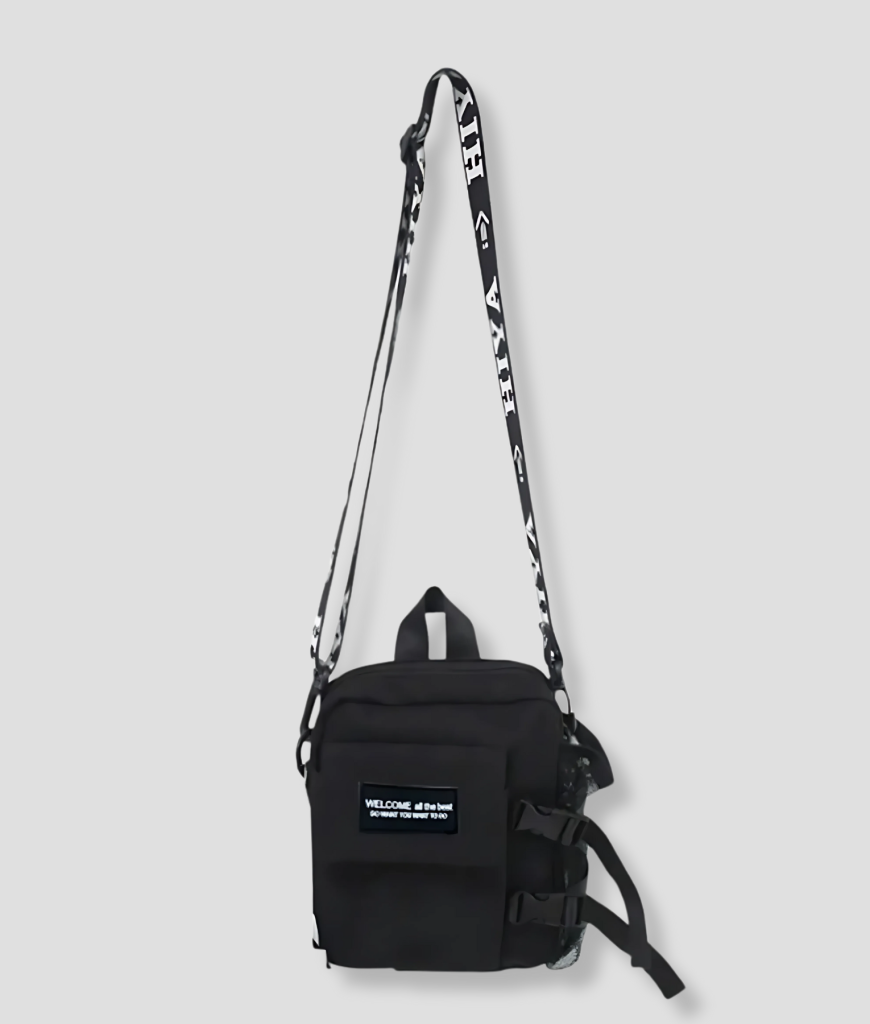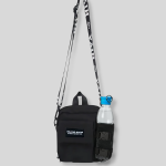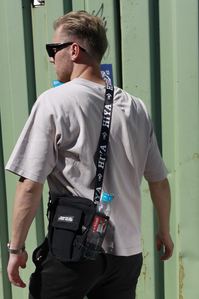 Strak zwart, compact en slim. Links het hoofdvak voor je essentials, rechts de verstelbare bottle sleeve die je fles of blik strak vastpakt. De band heeft die grafische print die net genoeg attitude geeft op het festivalterrein en in de club. Het silhouet blijft low-profile zodat je soepel door de menigte beweegt, maar pakt onder de lasers toch een vleugje glans. Clean aan de buitenkant, stiekem boordevol functies aan de binnenkant—precies zoals jij het wilt.