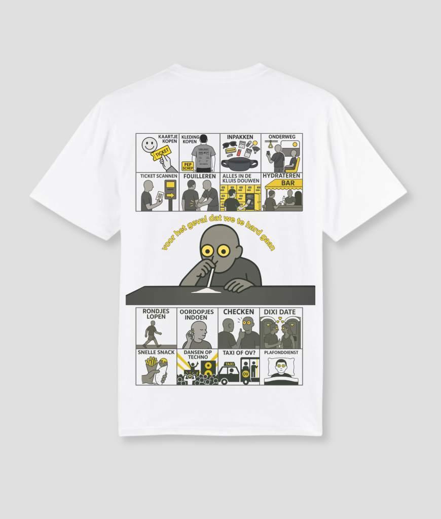 Een grappig en herkenbaar shirt dat de typische festivalchaos perfect weergeeft. Met allerlei iconische situaties zoals fouilleren, lange rijen, snackpauzes en dixi-dates is dit design een knipoog naar hoe chaotisch festivals kunnen zijn. Ideaal voor iedereen die met humor en zelfspot wil laten zien dat ze de festival struggles helemaal begrijpen.