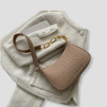 - Draagwijze en Details: Compleet met een elegante, vaak donkere ketting of een contrasterende lederlook band (zoals op de afbeelding), is dit een blikvanger. Draag haar overdag als schoudertas en ’s avonds als strakke heuptas.